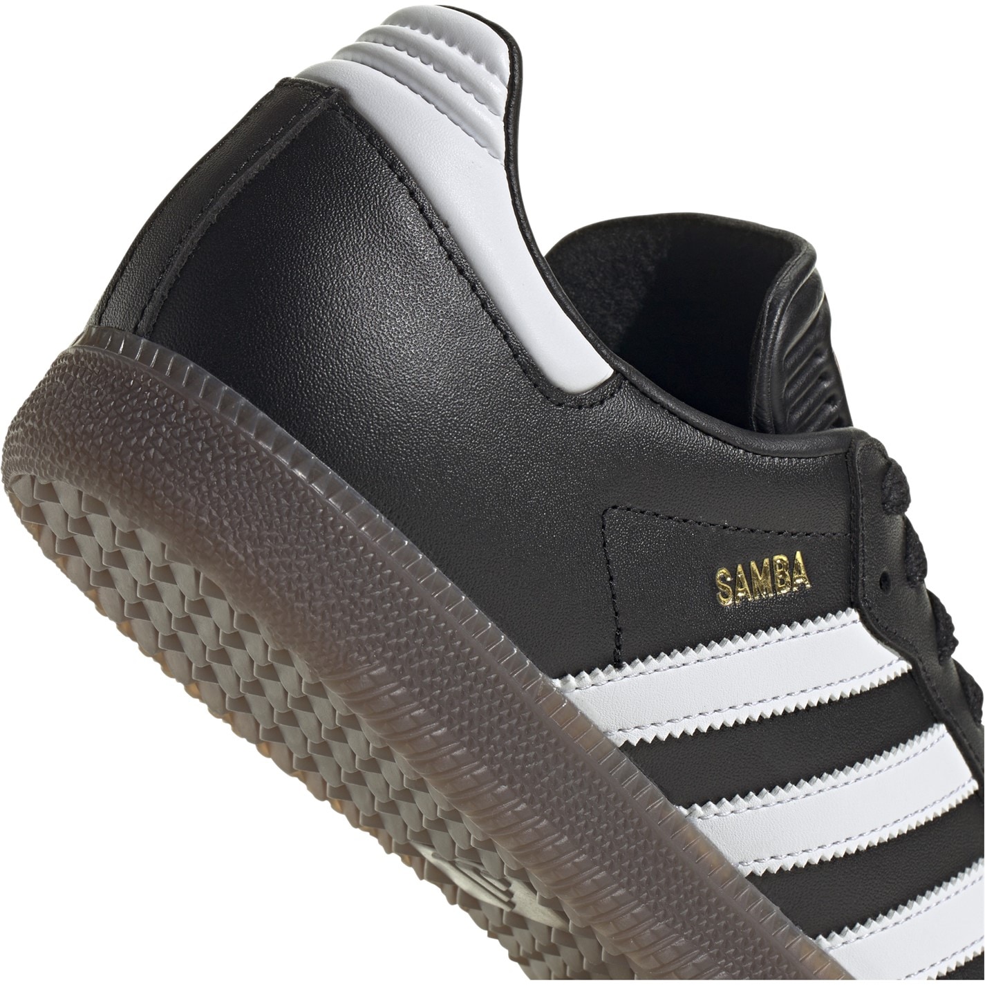 These trainers feature a die-cut EVA insole for lightweight comfort. This means your child can move freely and swiftly, without feeling bogged down. The EVA insole provides premium cushioning and support. Fitted with a NON MARKING gum rubber outsole, designed to provide excellent grip on all indoor surfaces. Whether it's a game of basketball, indoor soccer, or simply running around the gym, these trainers will keep your child steady on their feet, allowing them to focus on their skills without worrying about slipping or sliding. Finished in a solid block black colouring and complete with the iconic three striped design in contrasting tonal white. The iconic Samba name is printed in gold running alongside the stripe patterning for a stylish and sporty finish.