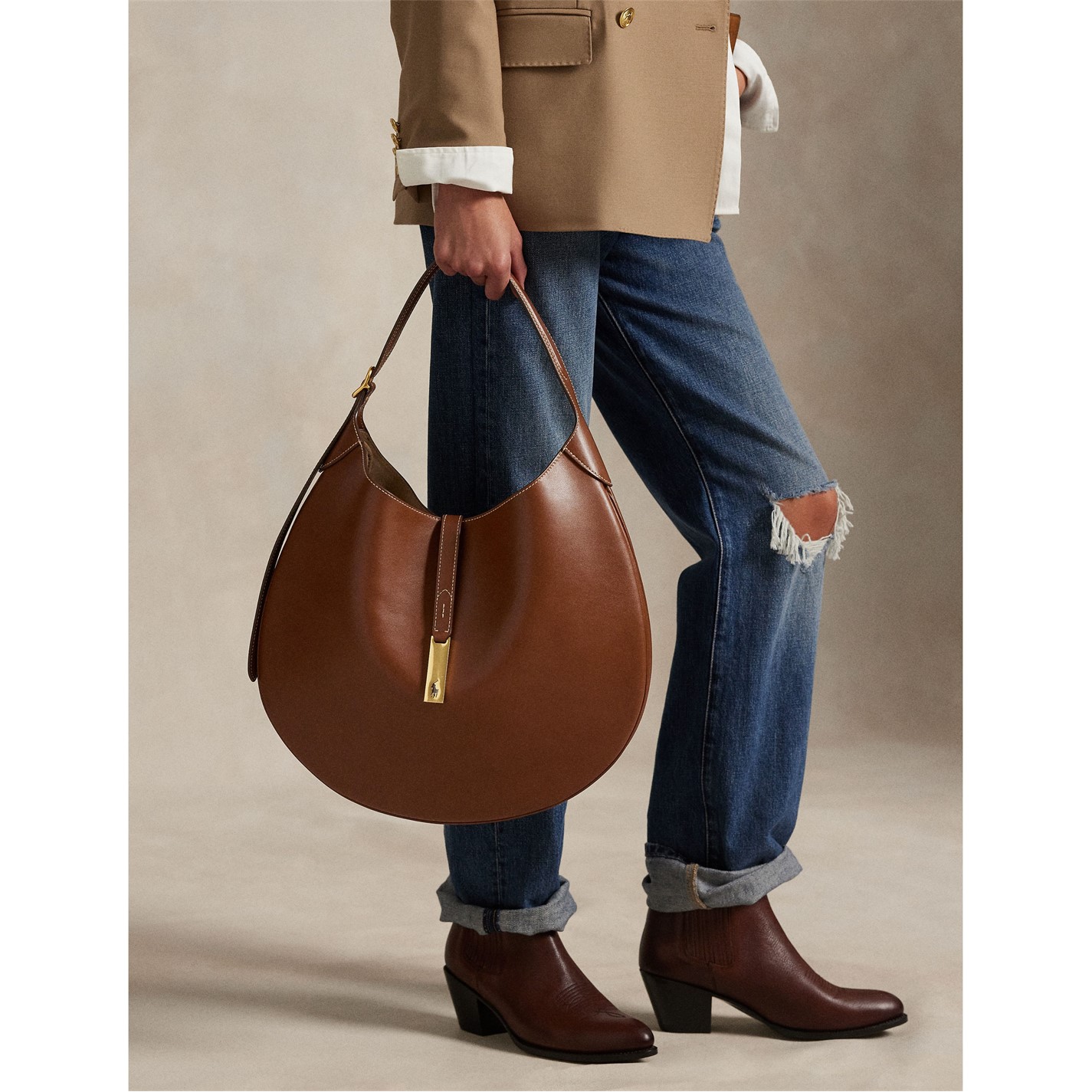 The gold-tone hardware adds a touch of opulence, while the classic colours and signature pony detailing reflect Polo Ralph Lauren's iconic aesthetic. Whether attending a business meeting or enjoying a leisurely brunch, the Polo Ralph Lauren Shoulder Bag is the ideal companion, effortlessly completing your ensemble with a touch of luxury.