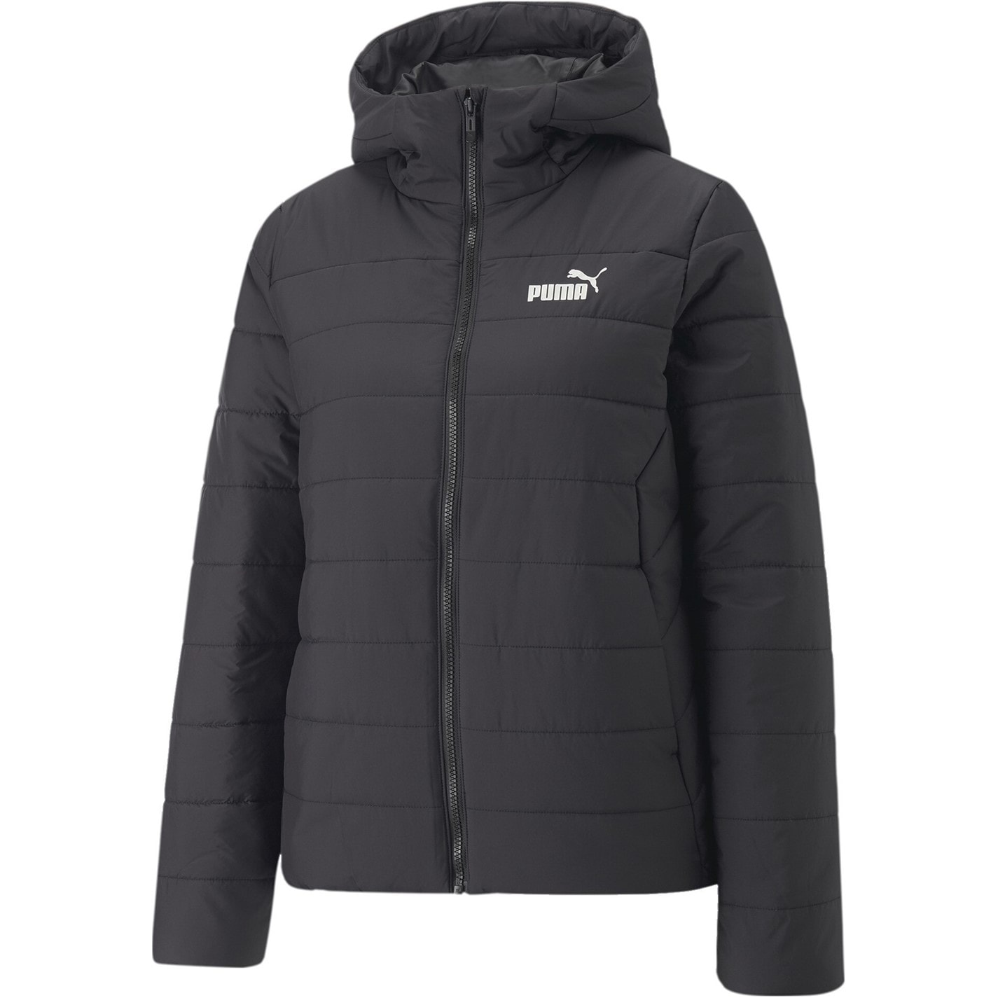 Puma Women's ESS Water Repellent Hooded Padded Puffer Jacket delivers essential warmth with advanced warmCELL thermal insulation that traps heat close to your body. This winter coat features water-repellent fabric that shields against both wind and wet conditions during outdoor activities, while fleece-lined zip pockets provide cosy storage for essentials.
